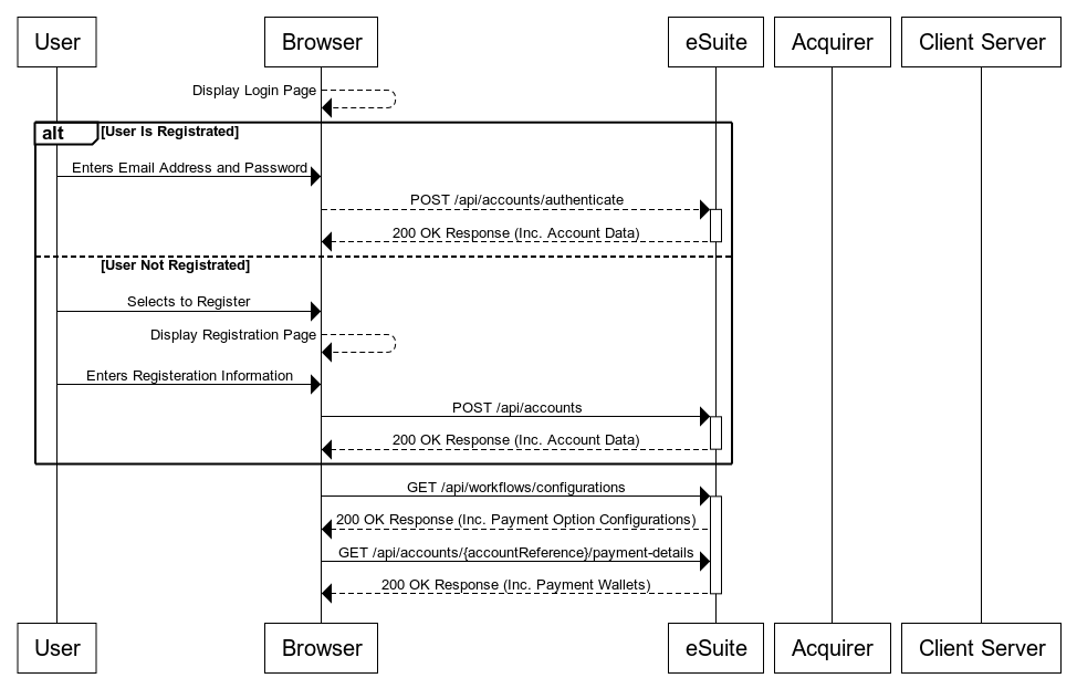 以下の図にて、既存のユーザーを認証する方法または新しいユーザーを作成する方法のクライアント側の実装を示しています。このフェーズは、ユーザーがバンドルを選択する前に実行できることにご注意ください。ユーザーが既にアカウントを所有し、購入をする前にログインしている場合があります。以下の情報では、eSuiteがプライマリID管理システムであると想定していますが、このフェーズでサードパーティIDMを統合することは可能です。