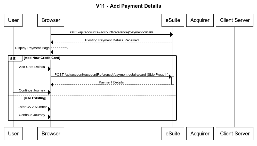 If the user decides to use their existing details that were retrieved previously, you should prompt them to input their CVV number again and store this much like the above. No API call is required as the CVV number will be passed into the complete purchase API in the next phase.