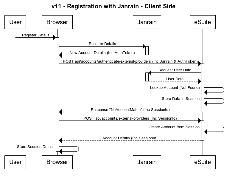 Once the user is registered within Janrian, the browser will then call the eSuite Platform with the Janrain AuthToken. The initial call to the eSuite platform will determine if the users account already exists, during this check eSuite calls to Janrain with the AuthToken passed in to retrieve the account details stored in Janrain.