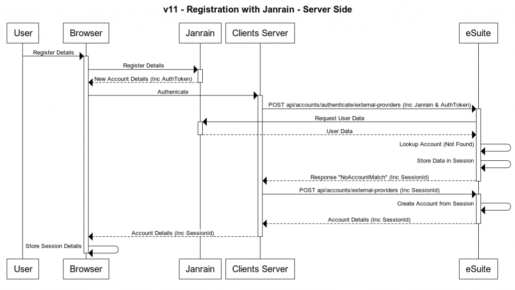 As soon as the middle ware has the Janrain AuthToken, either from the browser or in the response from Janrain the middle ware makes a call into eSuite passing in the Janrain AuthToken. This initial call to the eSuite platform will determine if the users account already exists, during this check eSuite calls to Janrain with the AuthToken passed in to retrieve the account details stored in Janrain.