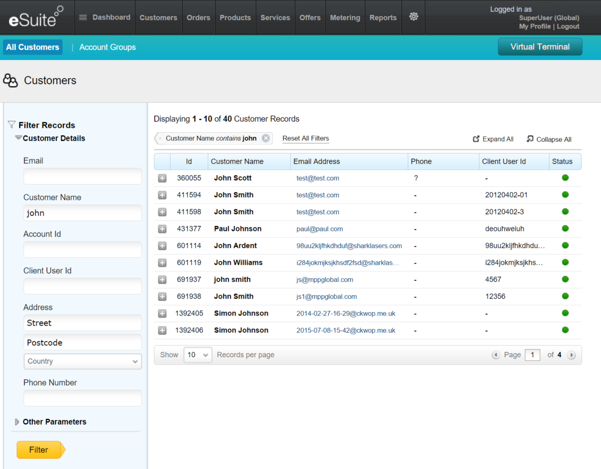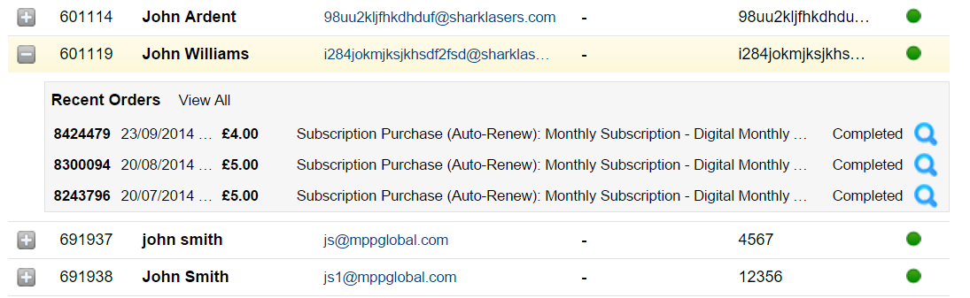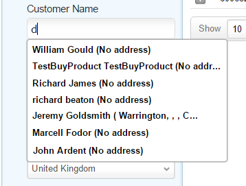 条件として入力する文字は部分的でも構いません。例えばReginaldという名前を検索するのに、文字列 「gina」と入力します。 検索結果には、顧客名の欄にこの文字を持ち、かつ他の欄に入力した条件と一致するすべての記録が一覧表示されます(恐らくGinaやReginaなどの名前を持つ顧客の記録も含まれているでしょう)。メールアドレスまたは顧客名の欄ににデータを入力する場合、入力補完機能が働いて、候補一覧がダイナミックに提示されます。例: