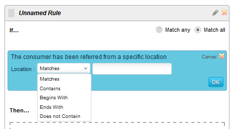 ユーザーが特定のサイトのリンクを使用してコンテンツにアクセスしようとした状況を指します。この条件カードをルールパネルにデプロイすると、下図のようになります。