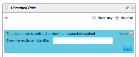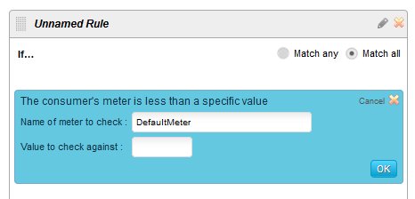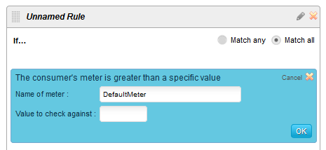 これは、アダプタが「メータリング & アクセス管理」モジュールに返す特定のパラメータおよび値がチェックされることを意味します。この条件カードをルールパネルにデプロイすると、下図のようになります。