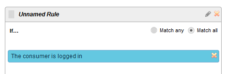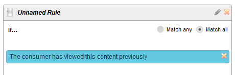 この条件では、現在のユーザーがリクエストしたコンテンツを以前にも閲覧したかどうかをチェックします。「メータリング & アクセス管理」モジュールが、現在のユーザーのユーザーIDを識別し、複数のアクセス要求についてユニークなアクセストークンを提供します。この条件では、モジュールが、ユーザが閲覧したコンテンツ部分の記録を追跡し、1度以上アクセスされたかどうかを判断します。この条件カードをルールパネルにデプロイすると、下図のようになります。