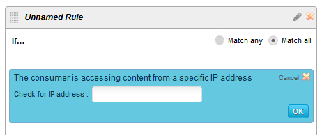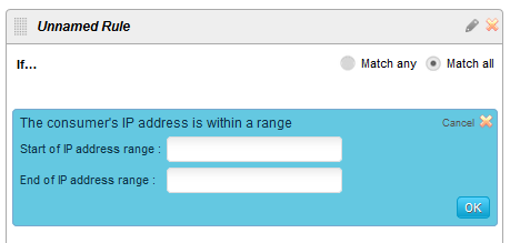 この条件がデプロイされると、2つのインタラクティブ欄が表示されます(テキスト入力も可)。最初の欄は[開始IPアドレス]で、次が[終了IPアドレス]です。この2つで範囲を定義します。適切なIPアドレスを追加し、OKボタンをクリックして条件をデプロイします。この条件は、ユーザーが同じネットワーク環境を共有する複数のユーザーの1人であることを確認するために使用することができます。職場や家庭内でのコンテンツへの共用アクセスを許可する場合に便利です。
