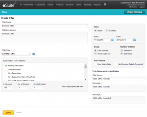 ユーザーオプション: 2種類の設定を行います。「新規ユーザーのみ」では、購読を再開した顧客がそのオファーを利用できるかどうかを設定します。「支払い情報不要」はユーザーが支払いの詳細情報を入力する必要がないという点で、サービスに関する無償試用期間と同様の処理が行われます。(この場合、割引は100%に設定され、オファー期間が過ぎるとオファーは自動的に終了します。サービスを継続したいユーザーはログインして支払い詳細を入力し、支払い手続きを開始しなければなりません。 )