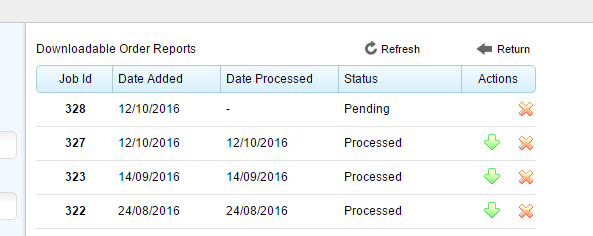 レポートを削除するには、オレンジ色の十字アイコンを選択します。緑色の下向きの矢印を選択すると、レポートをダウンロードすることができます。
