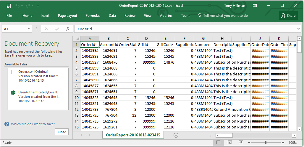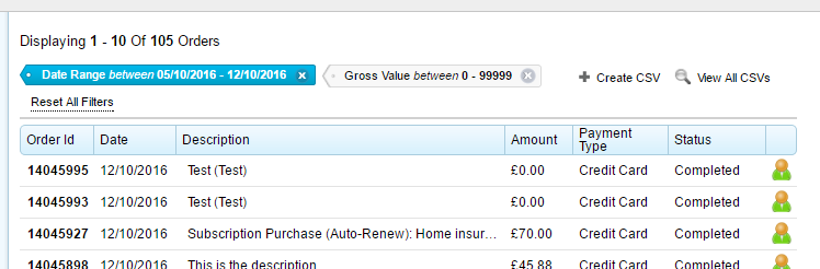 左側の縦のパネルを利用して様々な条件で検索を行うことができます。各行の右端のアイコンは、注文が特定のユーザーのアカウントに関連するものであることを示します。このアイコンをクリックすると、注文した顧客のアカウント情報画面が開きます。