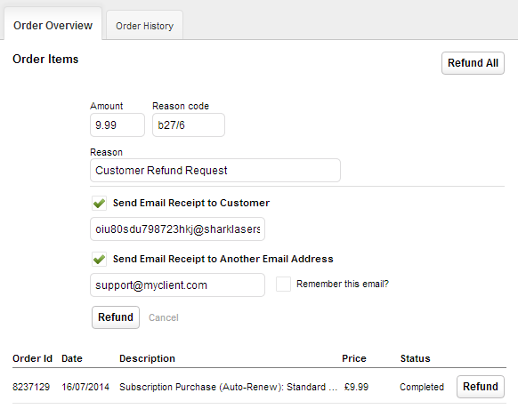 返金理由コードおよび・または返金理由を入力することができます。返金処理は、カスタマーサポート記録に記載され、注文データベース上の返金取引に返金内容が反映されて保存されることになります。必要に応じ、「現在のメールアドレス」あるいは「新規メールアドレス」、およびオプションの「追加アドレス」のいずれかを使って領収書を顧客に送信することができます。[このメールアドレスを覚える]オプションを選択すると、次回からメールアドレス欄に自動的にメールアドレスが提示されます。