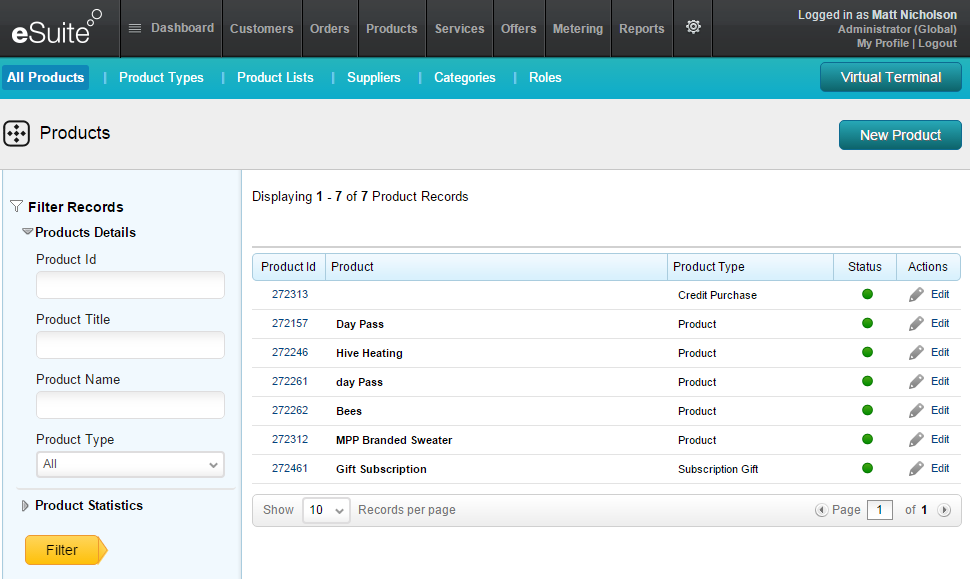 商品タブでは、物理的な商品、単品購入、ギフトの購読等について、1回で支払いを済ませる設定および商品の管理を行うことができます。製品はカテゴリーに分類され、サプライヤー情報を管理することができます。 eSuite HQの包括的顧客関係管理ソリューションにおいて、商品管理は重要な機能です。