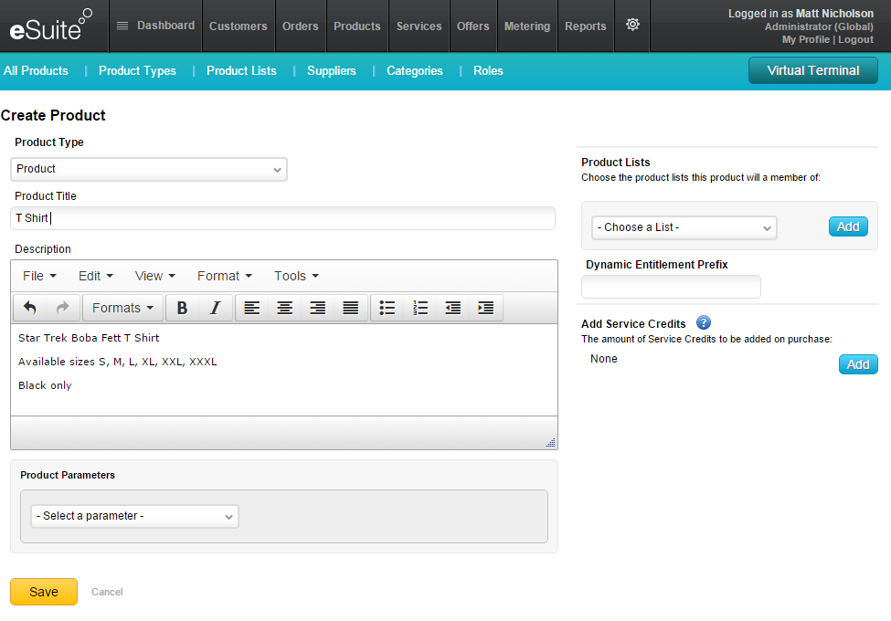 新規商品画面では、商品説明を作成するためのエディタと、カスタムパラメータを定義する機能が提供されます。この画面を使用して、商品一覧への商品の追加あるいは除外が可能です。商品についてのアクセス権限も追加できます。