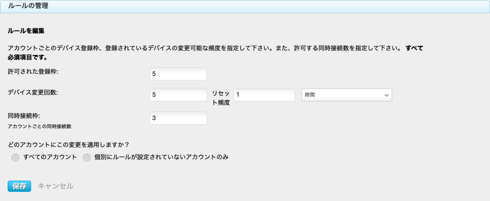 - 同時接続可能なデバイス数 - 登録されているデバイスのうち、何台まで同時接続が可能かの設定。