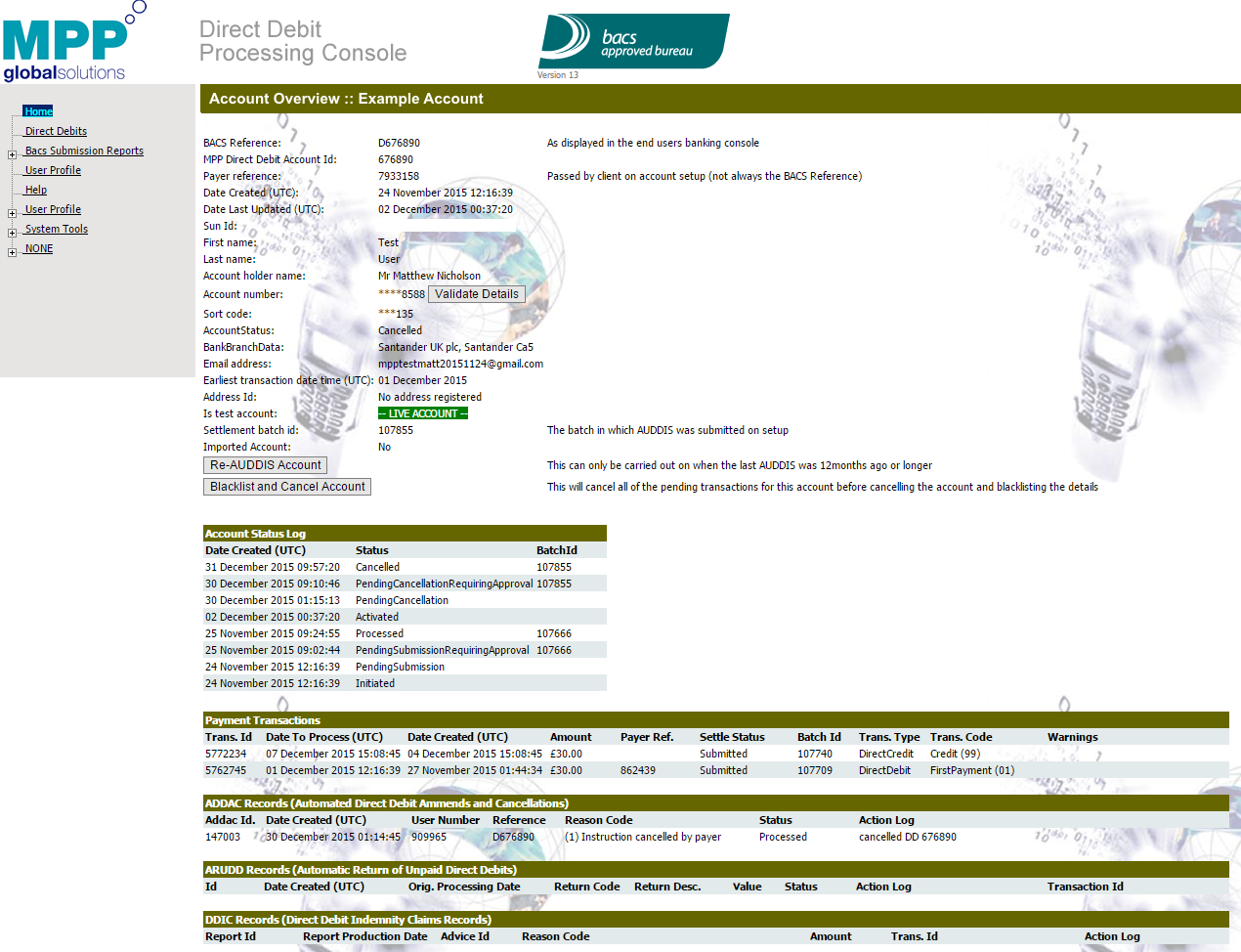 コンソールの顧客アカウントの表現には、支払者の参照を含む各アカウントの詳細が含まれます。 eSuite HQの顧客のAccountIdを参照します。 また、ユーザーが行ったBACSトランザクションのリストと、口座引落し作成(および場合によってはキャンセル)のタイミングがございます。