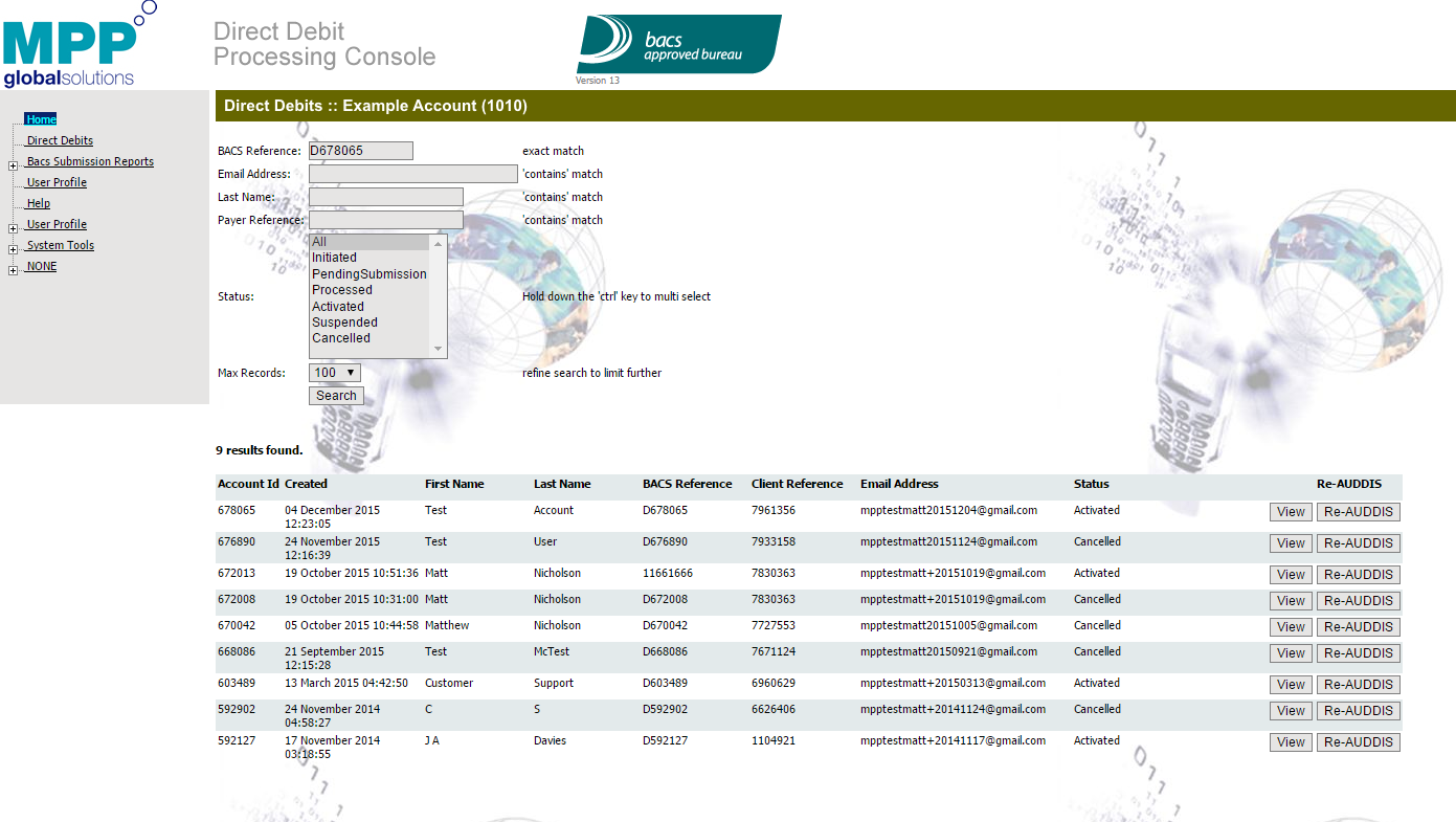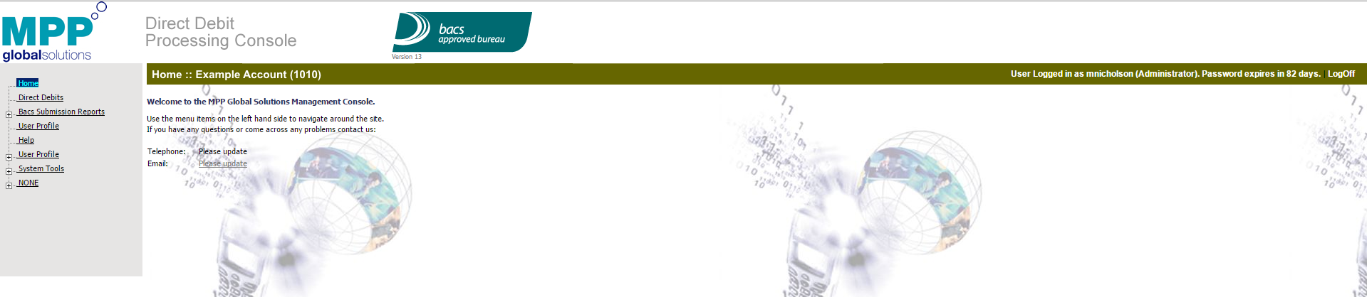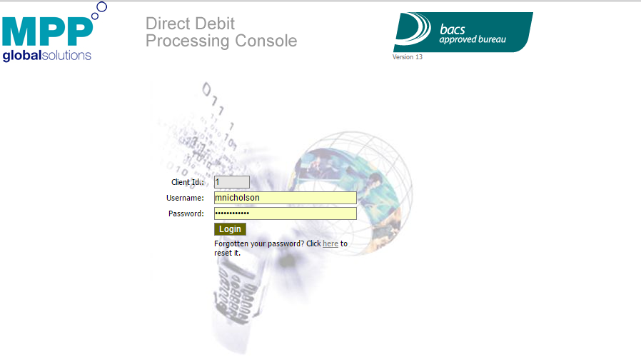 eSuiteの BACS口座振替管理コンソールは、BACSファイルの承認または拒否、およびユーザーアカウントの表示の両方に使用されます。 コンソールは次の通りです: https://directdebit.mppglobal.com/management/management/mpplogon.aspx
