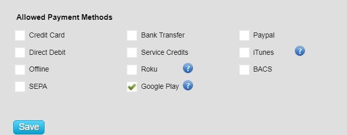 To use Google Play Native Billing in eSuite, the subscription-service must first be configured in eSuiteHQ. It is recommended that the configuration of the subscription service matches the configuration of the Google Play Service (including pricing and contract length). Once this has been configured, the payment method of ‘Google Play’ will be available in the allowed payment methods selection: