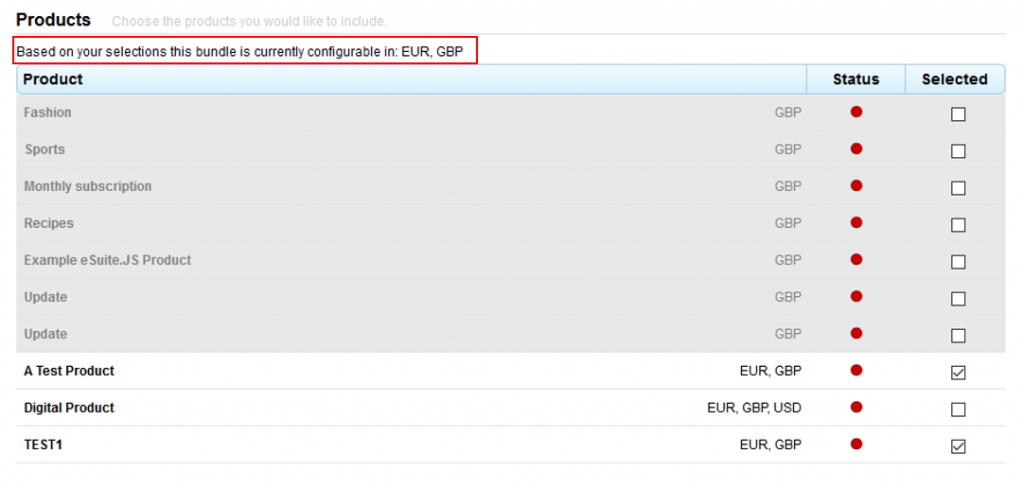 Currencies - by selecting products from the list, the subtitle to the section then displays which currencies the bundle will be purchasable in. Products can only be selected if there are common currencies. The first product selected is what is used to find common currencies and must meet the same criteria. For example, if the client selects product A, which includes only GBP and then selects product B which includes GBP & EUR, then the only currency available for that package will be GBP. The UI intuitively keeps track of this, rendering any products non-selectable due to not having a common currency configured.