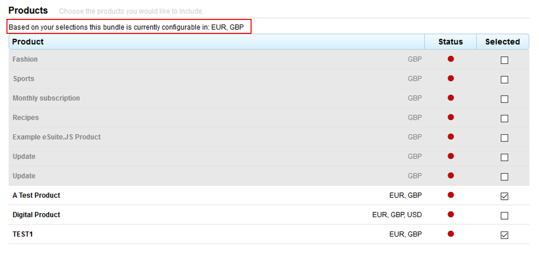 The products pane will display all valid products and all currencies (those with a product type of Physical or Digital only). There is no restriction on a maximum number of products that can be selected but before the client can proceed to the next step of the configuration process they must have selected at least 1 product.
