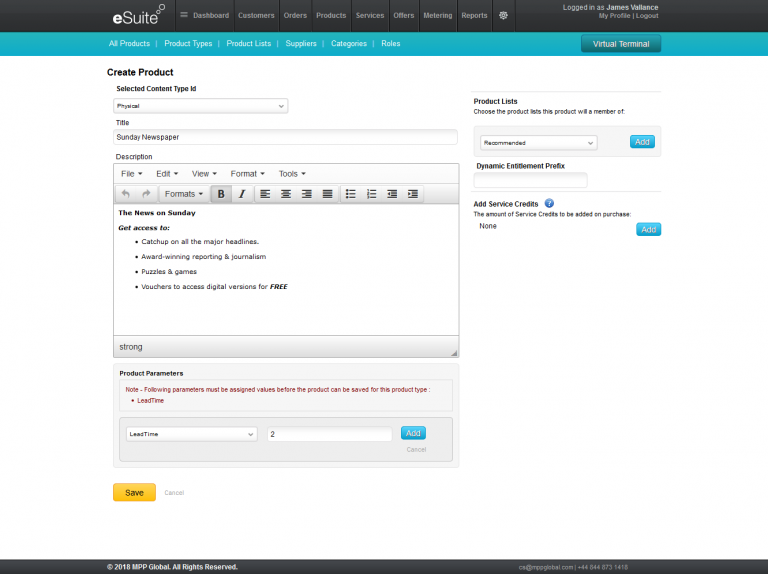 • Product status set to Active