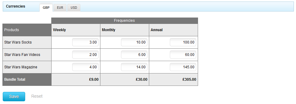 The matrix itself defaults the pricing set against the product across all frequencies. This is where clients can tailor the price to suit the bundle.
