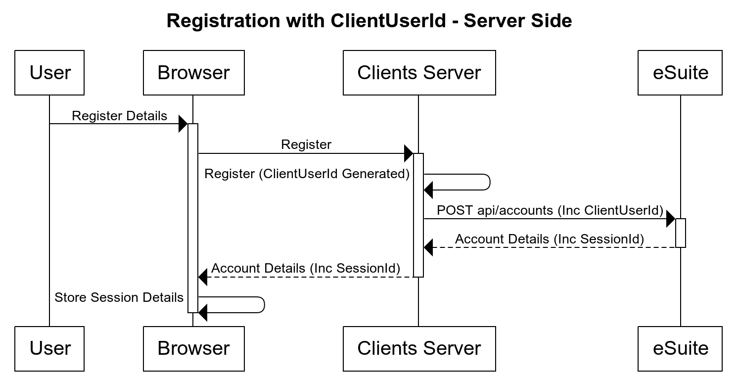 eSuiteがセカンダリIDMであり、eSuiteプラットフォームへのリンクがeSuite内のクライアントユーザーIDに保存されているプライマリIDMの識別子を介している場合のアカウントの登録です。 eSuiteを呼び出す前にプライマリIDMプラットフォームによって認証が実行されるため、この登録はミドルウェアサーバーを介して処理する必要があります。