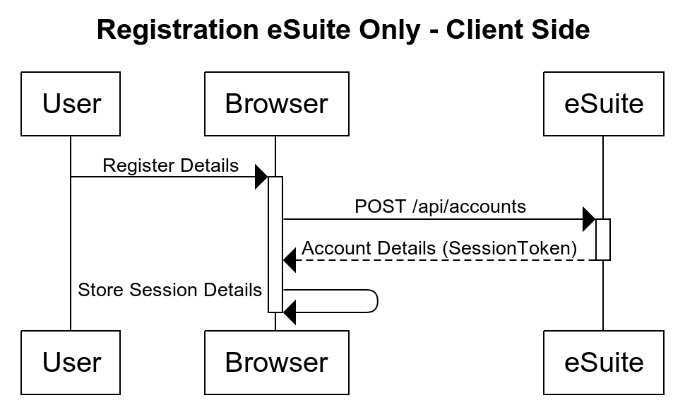 次の図は、ユーザー登録フローのクライアント側の実装を示しています。このフローでは、ブラウザからeSuiteプラットフォームへの単一のAPI呼び出しが直接行われ、ユーザーの登録が実行されます。