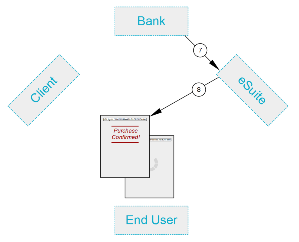 8. If authorisation has been forthcoming, eSuite sends a confirming event to the Client-side, and a Confirmation-page is duly shown. Note that also dispatched from eSuite is a ReturnURL, which was specified by the client as part of the CreateSession call. By means of this URL, the end-user can return to the client-site (here illustrated as by means of pressing OK).