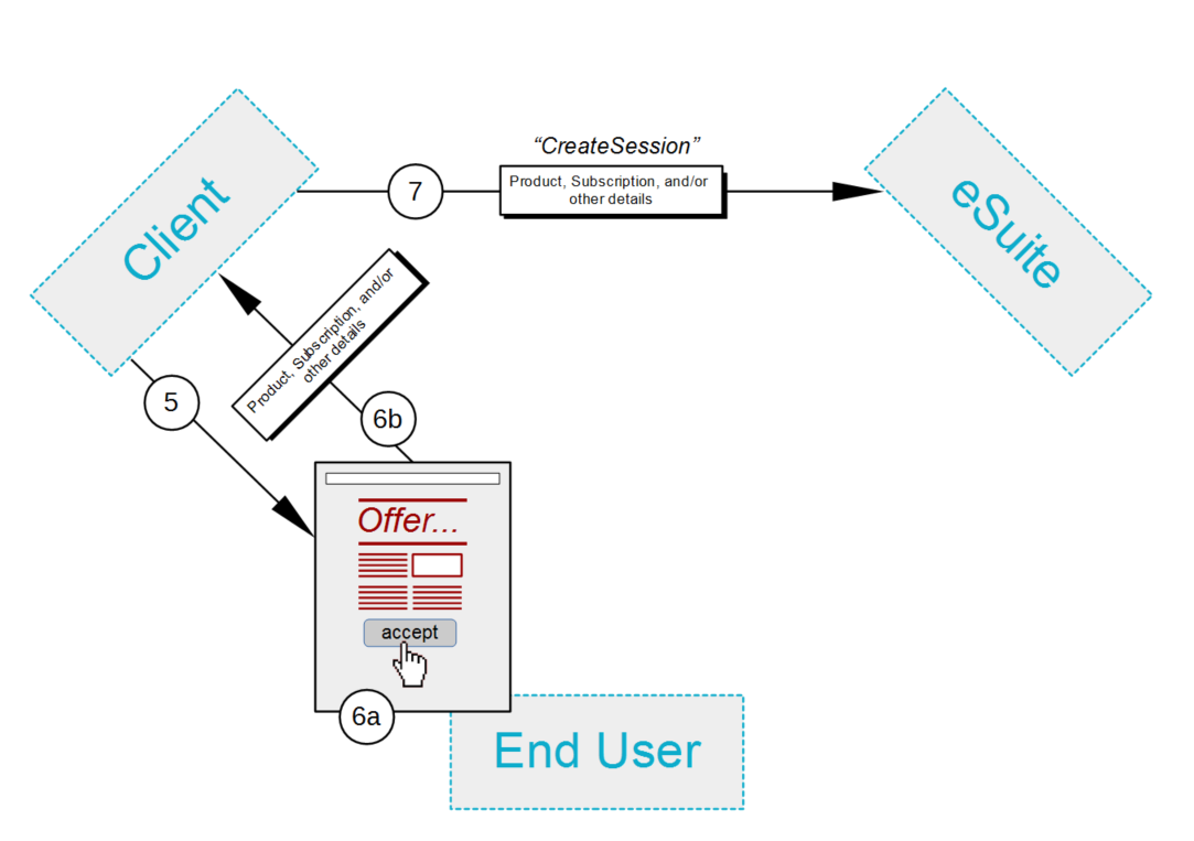 7. クライアントは、 CreateSession APIを使用して、直前の購入をeSuiteに通知します。この呼び出しは、エンドユーザが購入したい製品またはサブスクリプションの詳細サブセット全体を伝えます。