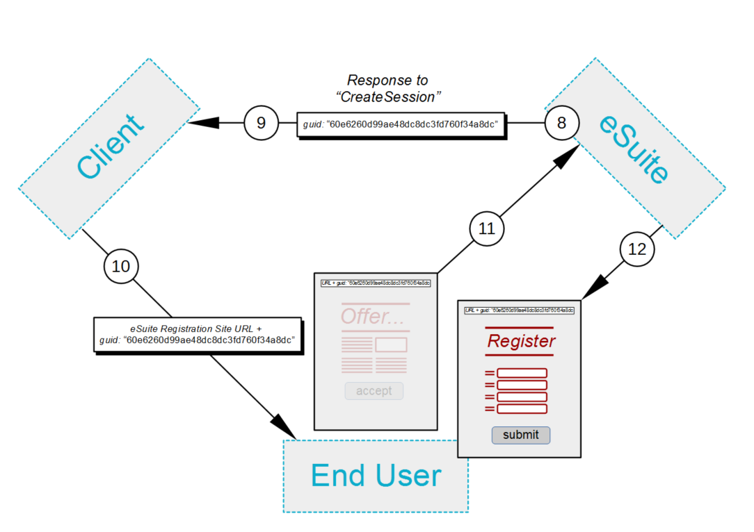 eSuiteは、登録と購入の準備として、エンドユーザ用のセッションを作成します。このプロセスでは、eSuiteはセッショントークン(a GUID )を生成します。これによりエンドユーザーは登録するWebサイトに到着したときに識別できます。